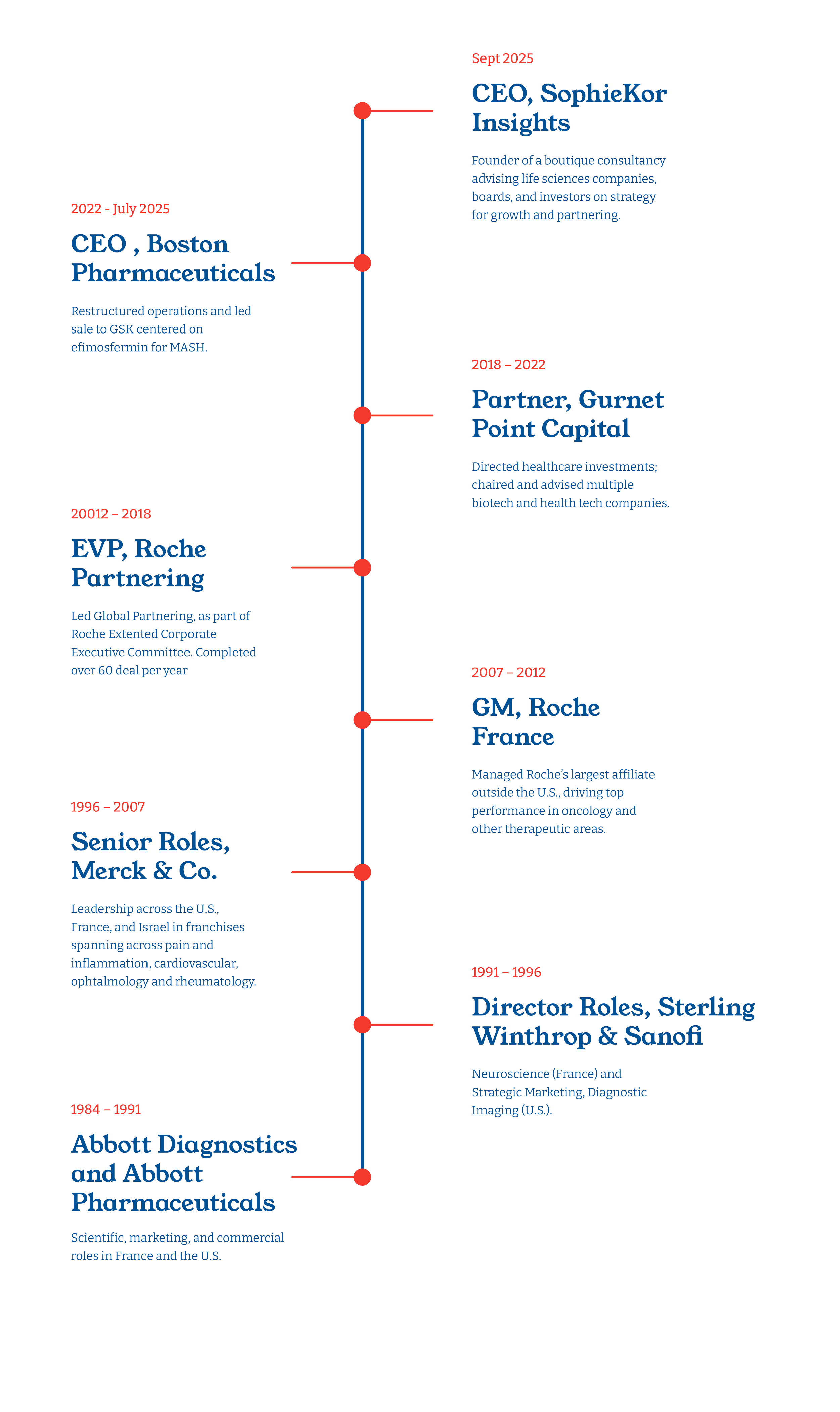 Sophie Kornowski, PharmD, MBA, is a seasoned executive with 30+ years in global pharmaceuticals, biotech, healthcare, and investment has established a consulting company to support her peers. Most recently, as CEO of Boston Pharmaceuticals, she reshaped its strategy and led the deal with GSK around efimosfermin for MASH. Previously, as Partner at Gurnet Point Capital, she drove early-stage investments, licensing deals, and served on multiple boards. At Roche, she was Executive Vice-President, Head of Roche Partnering, and a member of the Corporate Executive Committee. In this position, she led major acquisitions including Foundation Medicine, Flatiron Health, and InterMune, as well as 70+ global deals annually. Earlier, Sophie was General Manager of Roche France and held senior roles at Merck & Co., Sanofi, and Abbott. Sophie holds a PharmD from Paris Descartes University and an MBA from Chicago Booth.